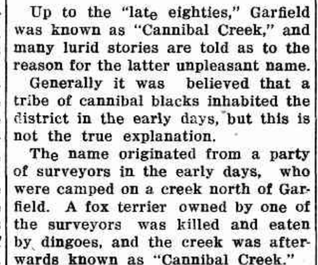 Up to the “late eighties”, Garfield was known as “Cannibal Creek,” and many lurid stories are told as to the reason for the latter unpleasant name. Generally it was believed that a tribe of cannibal blacks inhabited the district in the early days,’ but this is not the true explanation.