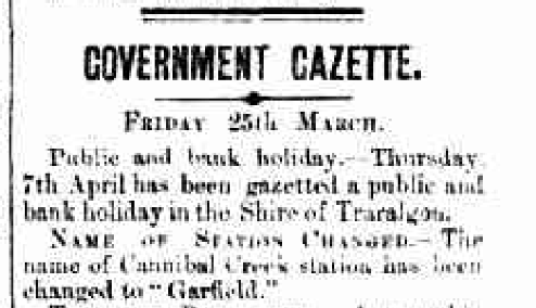 Regardless, Cannibal Creek was renamed Garfield on 25 March 1887, according to government gazette documents reported in local papers: