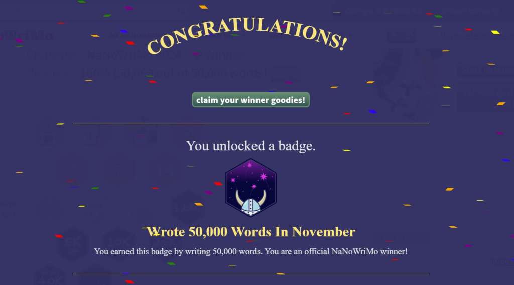 This is the fifth time I’ve successfully completed a manuscript during NaNoWriMo. I’m happy with what I produced, though I know it’s going to need an absolutely massive amount of editing.