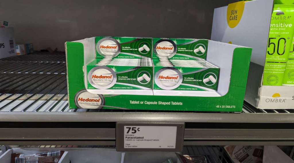 So I can confirm the winner of ALDI’s cheapest product is a 16-pack of Hedanol paracetamol, an ALDI store-brand painkiller that will set you back just 59 cents.
